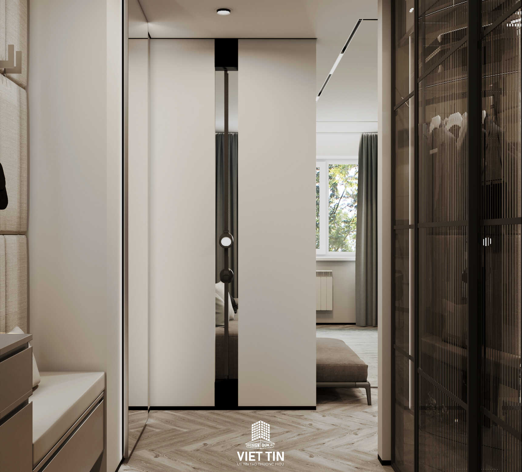 - Nội thất: Giường ngủ gỗ sồi tự nhiên bọc nệm, tủ âm tường tối ưu diện tích.